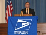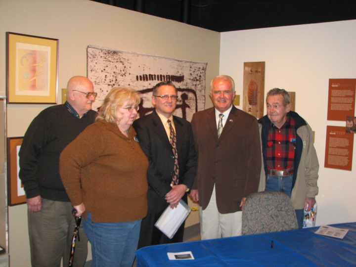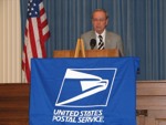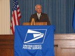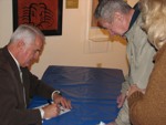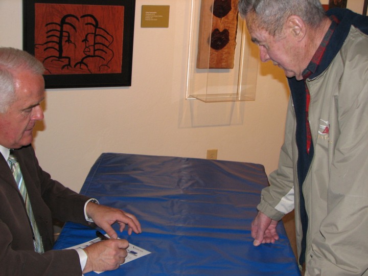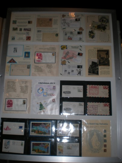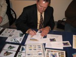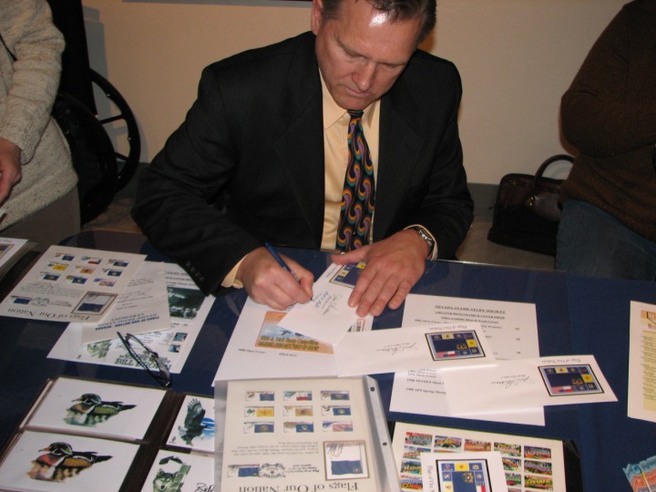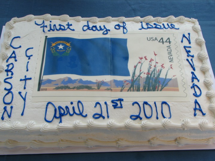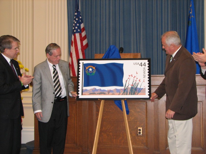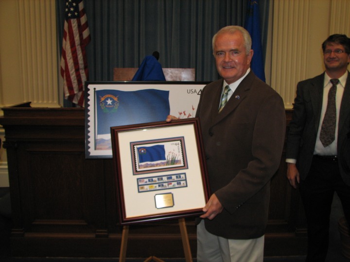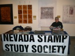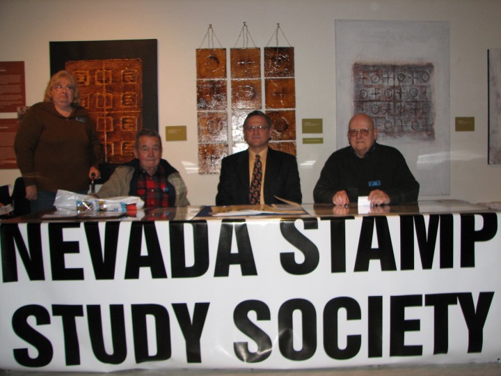 The Nevada Stamp Study Society had an exhibit and table inside the Nevada State Museum, just down the street from the State Capitol building where the new stamp was unveiled by Gov. Jim Gibbons. The governor and Carson City postmaster were at our welcome table to sign covers after the official ceremony.