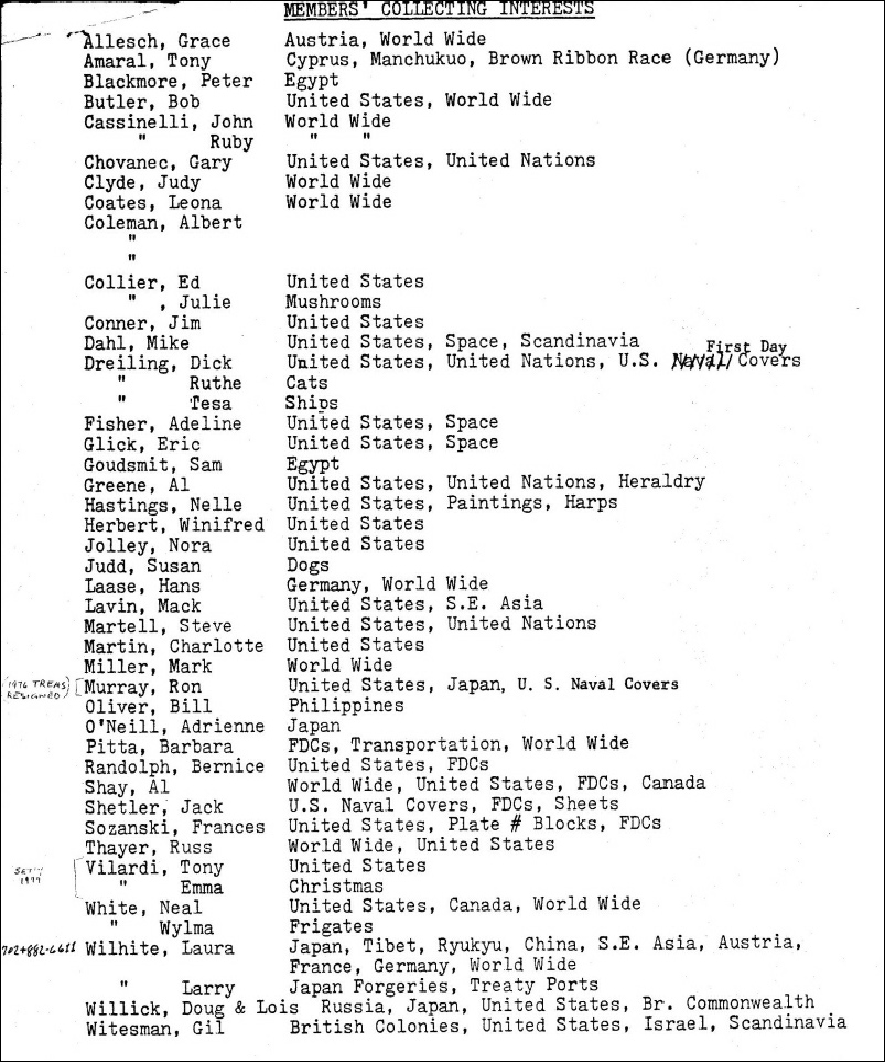 Sometime in 1976, no doubt before the Spring Exhibition, a list of collecting interests of the members was made. Below is that first membership list with collecting interests.