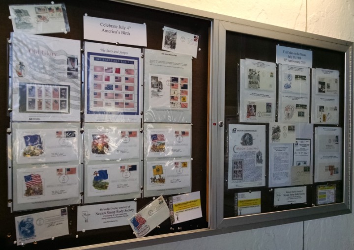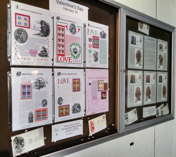The Vassar Street Post Office, the main postal facility in Reno, has allowed the Nevada Stamp Study Society the use of two locked wall display cases. Every two months the displays are changed. All the post office patrons pass by the display cases as they proceed to the postal clerks for service. Lots of interesting material has been on display. Sometimes a mini-exhibit is put together that comprises 6 pages to tell a story.