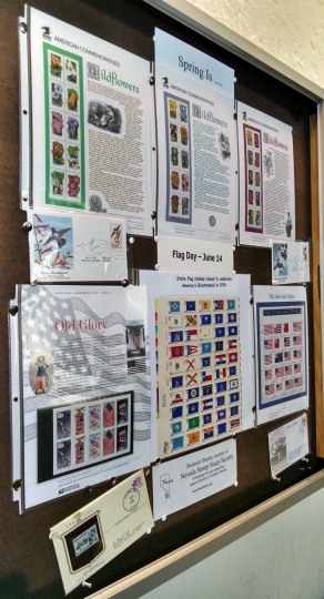 The Vassar Street Post Office, the main postal facility in Reno, has allowed the Nevada Stamp Study Society the use of two locked wall display cases since 2013. Every 6-8 weeks the display is changed. All the post office patrons pass by the display cases as they proceed to the postal clerks for service. Lots of interesting material has been on display. Sometimes a mini-exhibit is put together that comprises 6 pages to tell a story.