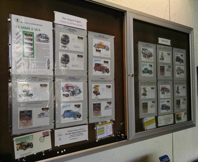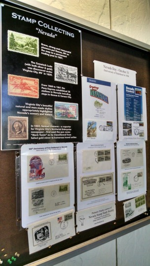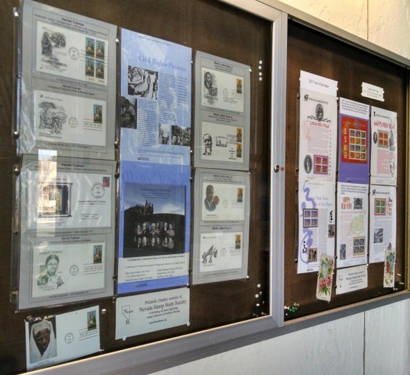 The Vassar Street Post Office, the main postal facility in Reno, has allowed the Nevada Stamp Study Society the use of two locked wall display cases since 2013. Every 4 weeks the display is changed. All the post office patrons pass by the display cases as they proceed to the postal clerks for service. Lots of interesting material has been on display. Sometimes a mini-exhibit is put together that comprises 6 pages to tell a story.